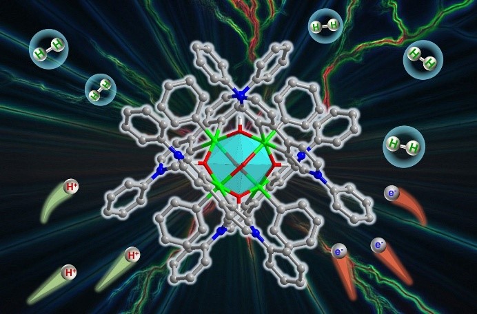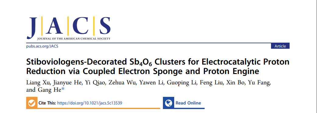 以上研究成果以《含锑紫精修饰的Sb4O6簇:通过耦合电子海绵与质子引擎实现电催化质子还原》(Stiboviologens-decorated Sb4O6Clusters for Electrocatalytic Proton Reduction via Coupled Electron Sponge and Proton Engine)为题,发表在国际化学领域权威期刊Journal of the American Chemical Society上。西安交通大学前沿院博士研究生徐亮为本论文第一作者,何刚教授为本论文通讯作者。西安交通大学新概念传感器及分子材料研究院房喻院士、刘峰教授,陕西师范大学薄鑫教授等合作者深度参与了本工作。该工作得到了国家自然科学基金,中国博士后科学基金以及分析测试共享中心支持和帮助。