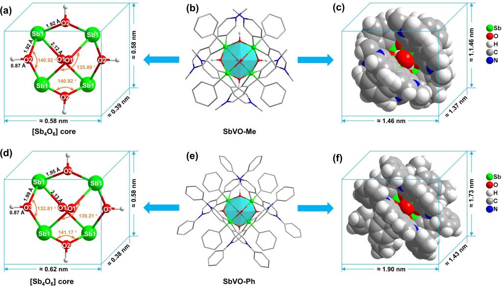 图2.含锑紫精修饰的Sb4O6簇的簇和单晶结构
